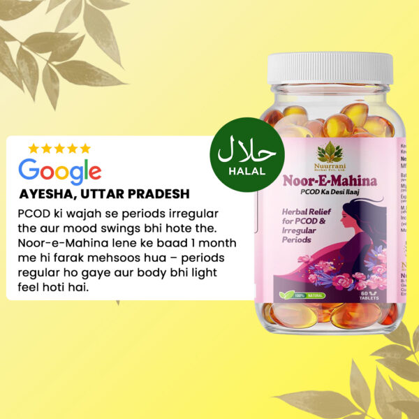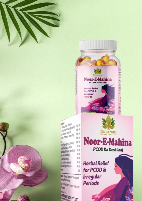 Noor-e-Mahina is a natural, non-hormonal herbal formula specially crafted to help regulate menstrual cycles and support the reduction of PCOD/PCOS symptoms.